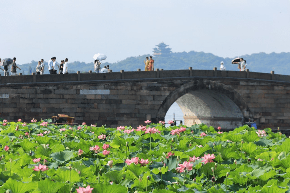 2023年7月1日,浙江省杭州市西湖景区断桥水域荷花盛开,景美如画,吸引游人驻足欣赏。