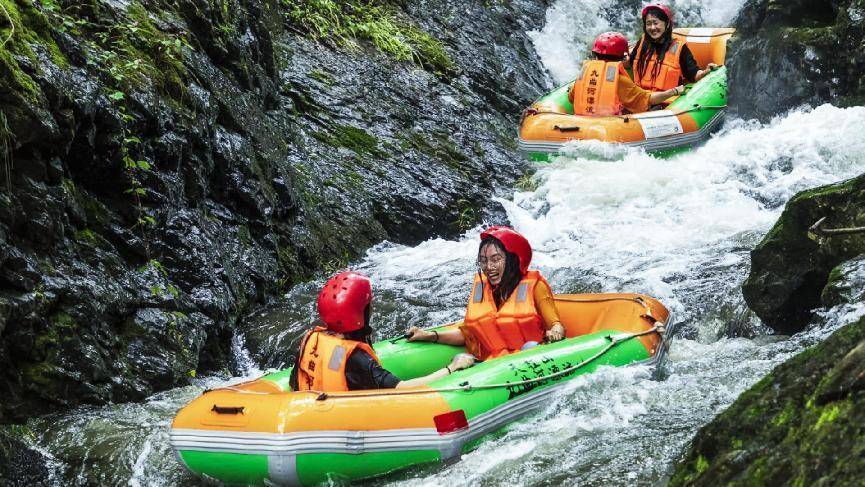 天柱山景区森林覆盖率98%,负氧离子含量为国际标准的20多倍,“中国天然氧吧”,令每一次呼吸都心旷神怡。天柱大峡谷曲径通幽,绿树成荫,大小瀑布跌落成群,宛如一个天然空调。白马潭、九曲河、凤凰源漂流,峡谷幽深,瀑潭相连,水流湍急。当你坐竹筏或皮艇上穿深潭、越险滩,与浪共舞之时,挑战的是你的智慧、勇气、胆识和毅力;在尖叫和欢笑声中,收获的是有惊无险的愉悦。