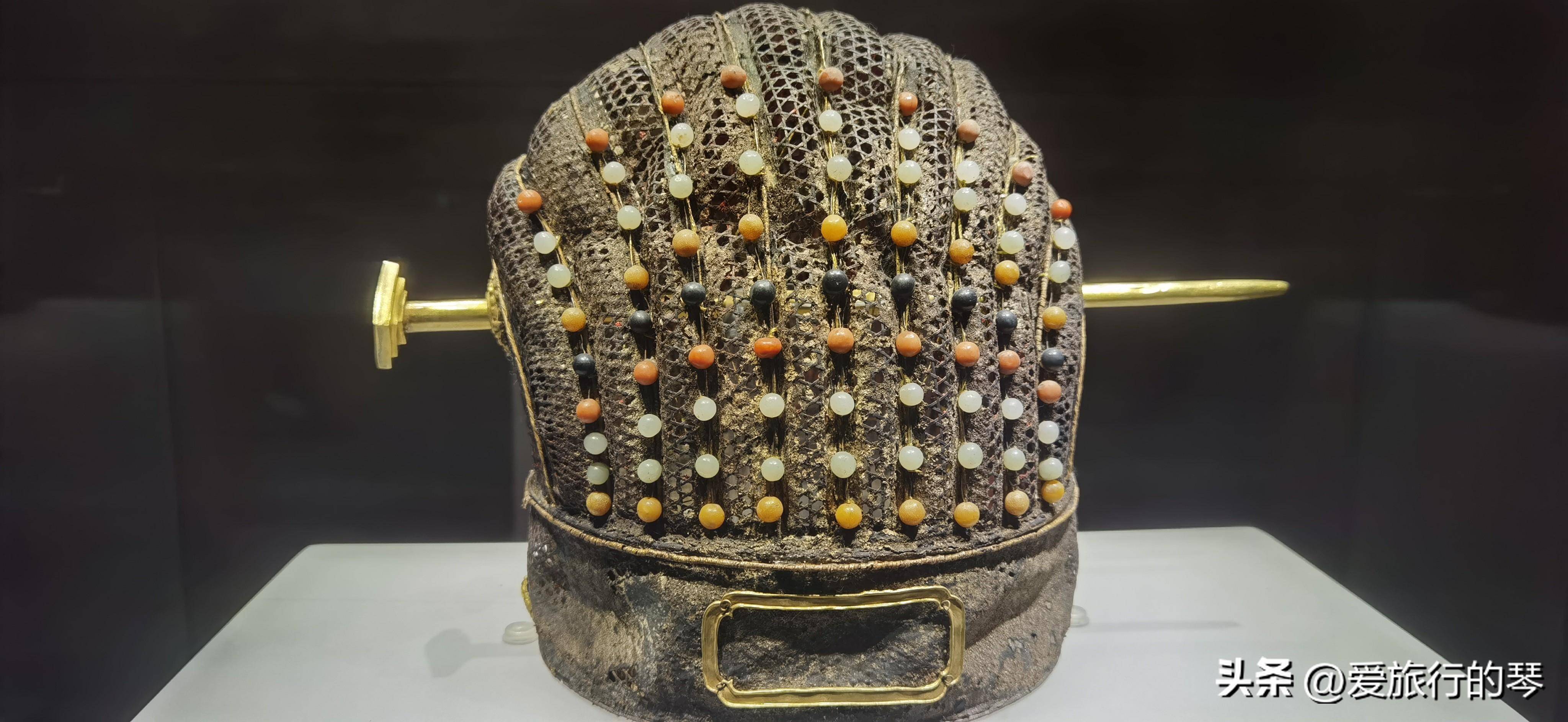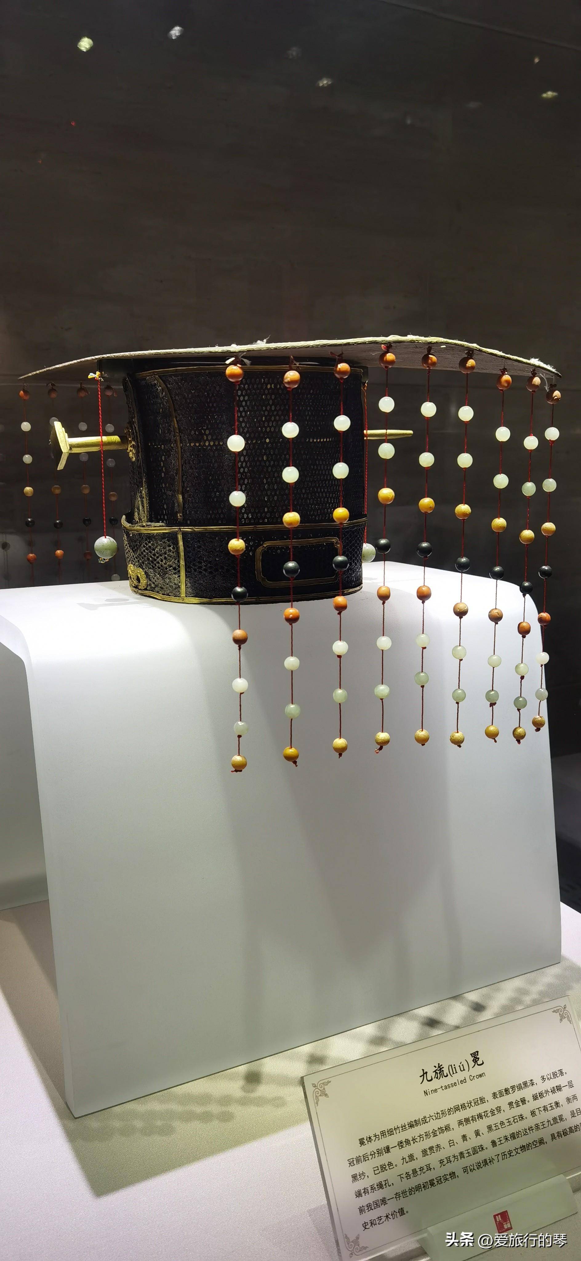 我最喜欢的宝藏之一,非常美丽且细致。九齿冕是明代鲁王朱潭墓出土的。帽前悬挂五色玉珠。它有五种颜色:红、白、绿、黄、黑。