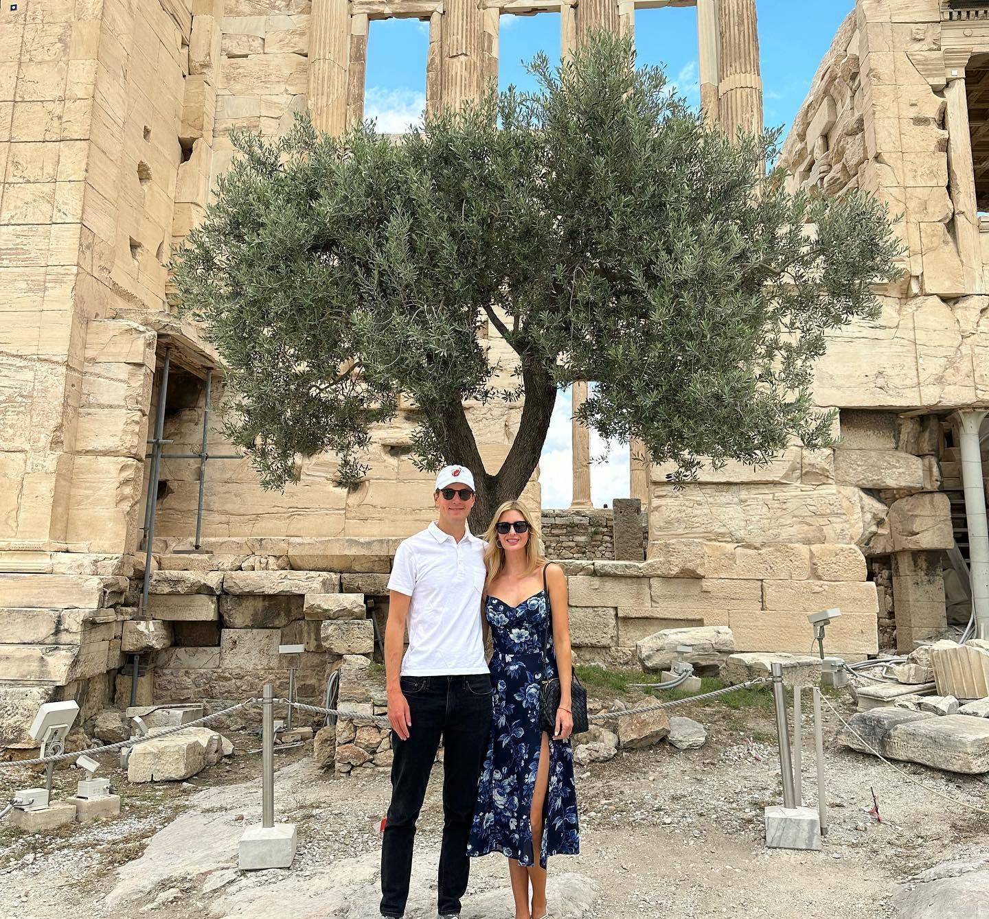 伊万卡与丈夫搂着她的腰合影。夫妻俩结婚多年,但每次都超级可爱。这次他们抛下三个孩子,前往希腊过着二人世界。