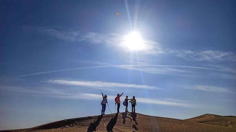 在沙山中行走要求队员有更好毅力与耐力,跟紧领队的步伐。途中需翻越几座比较高沙山,跨越穿沙公路,中途在沙漠中的绿洲边休息、路餐(注:每人需准备1.5升水,如不够多,沿途可补给)。