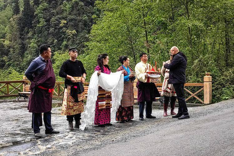 2点20分抵达波密,加油继续赶路。4点50分到达通麦桥,停下来短暂休息。遇到了穿着盛装的当地藏族来迎接客人。来访者介绍,十年前他在附近林场打工,现在来看望老乡。过了通麦大桥,穿过大呼呼嘴隧道和遮龙沟大桥,通麦的天险就过去了。以前需要一天时间的危险山路,现在只需20多分钟。高原的发展每天都在变化,开车不再困难。