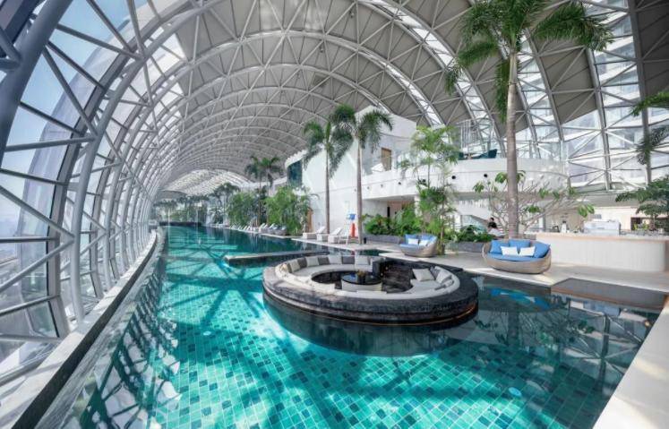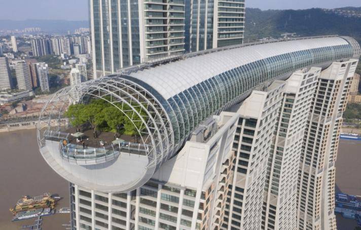 值得注意的是,重庆来福士城独特的空中“水晶桥”位于中心四座塔楼之上,全长300多米,宽30多米。水晶廊桥设计精美,设有观景平台、无边泳池、会所以及各种餐饮娱乐设施。