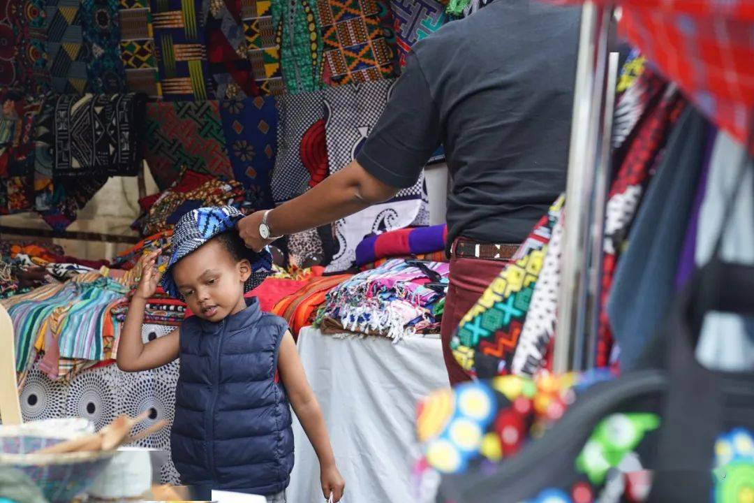 4月1日,一名儿童在肯尼亚首都内罗毕的集市上试戴帽子。