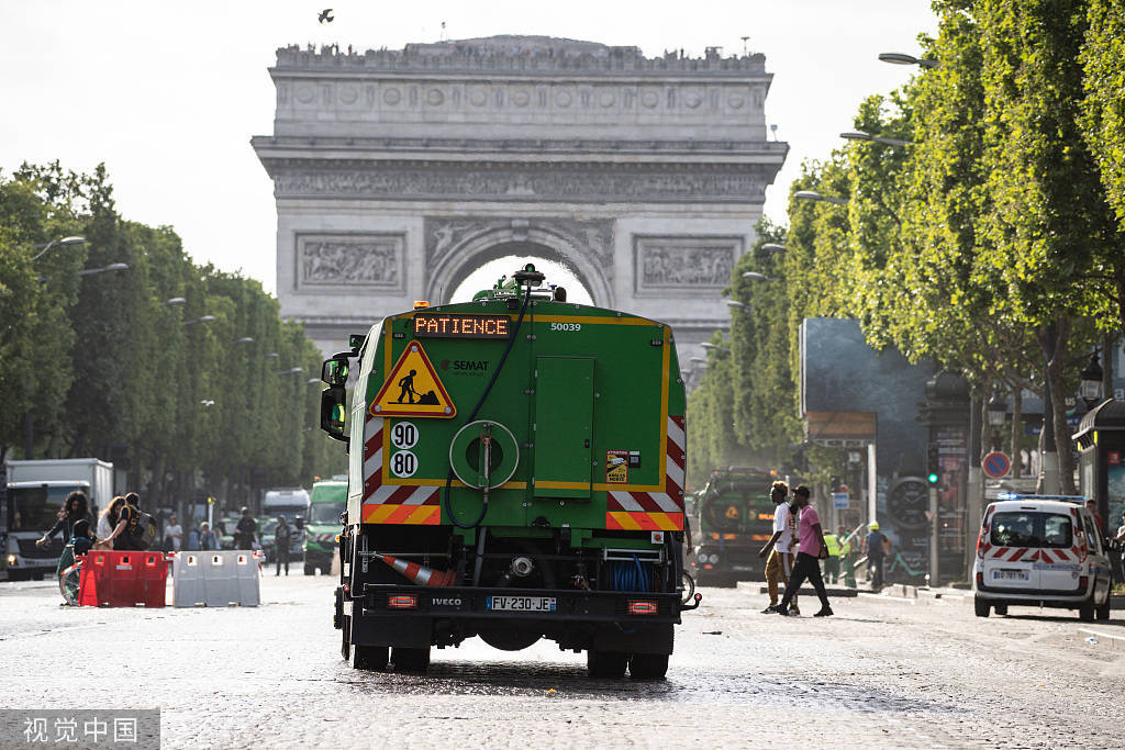 当地时间2023年7月2日,法国巴黎,市政工人在香榭丽舍大道上清扫。 视觉中国 图