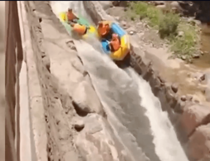 6月10日,河南三门峡一旅游景区游客被卡在漂流赛道,被后方的漂流船撞上后,两名游客双双落水,漂流船倒扣在两人头上,并且跟着湍急的水流往前冲。