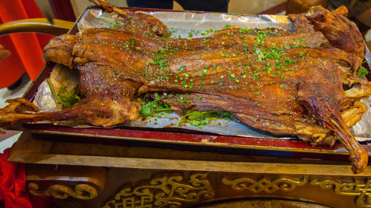 此外,烤全羊也是一种重要的社交方式,在各种场合如家庭聚会、商务宴请和朋友聚会中都经常出现。总之,烤全羊不仅是一道美食,更是中华文化的体现和精神传承。如今,烤全羊已经成为中国许多地方的传统美食之一,比如在新疆、内蒙古等地都有其独特的烤全羊做法和口味。
