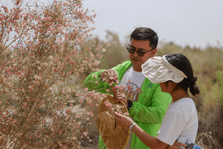 2023年6月12日,在中科院新疆生态与地理研究所策勒沙漠研究站天然试验区,买尔当和学生查看沙拐枣生长情况。新华社记者 郝昭 摄
