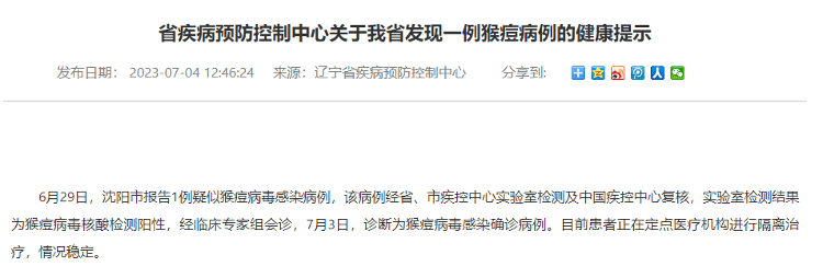 据辽宁省疾病预防控制中心网站4日消息,6月29日,沈阳市报告1例疑似猴痘病毒感染病例,该病例经省、市疾控中心实验室检测及中国疾控中心复核,实验室检测结果为猴痘病毒核酸检测阳性,经临床专家组会诊, 7月3日,诊断为猴痘病毒感染确诊病例。目前患者正在定点医疗机构进行隔离治疗,情况稳定。