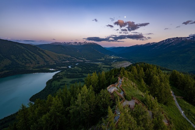 到达喀纳斯机场已经是晚上九点半了,虽然月亮已经在半空,但是天依然非常亮,而且太阳还没有落山,日月同辉。喀纳斯机场的房顶是是红色的,天空是湛蓝的,尼康Z 7Ⅱ对于色彩的还原非常准确,即使是直出JPG照片,依然可以完美的还原我们肉眼看到的景象和色彩。