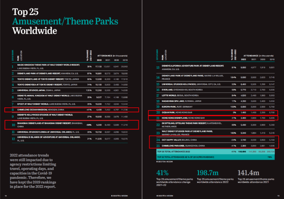 全球Top25主题公园排名,红框内为上榜中国主题公园(图源:《2022全球主题公园和博物馆报告》)