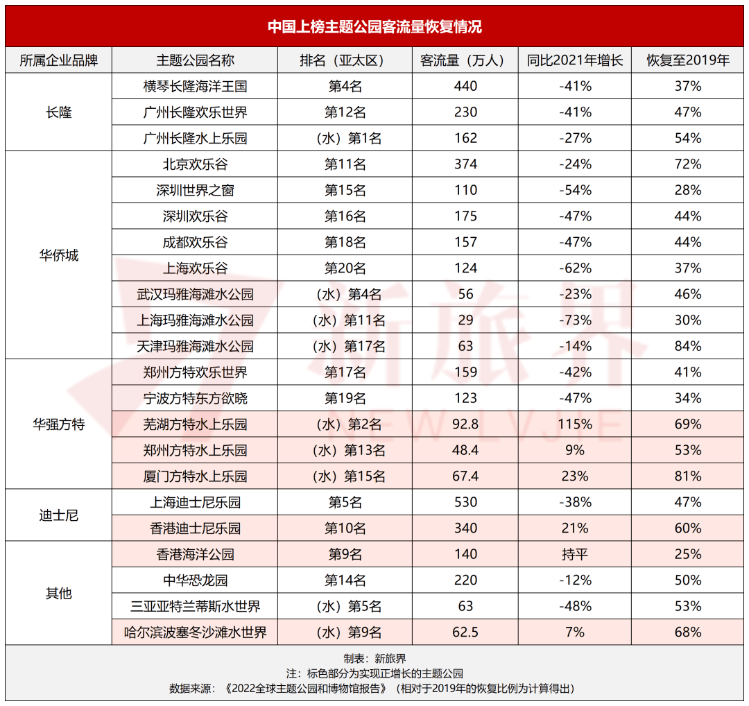 新旅界总结梳理了亚太榜单上所有中国主题公园的相关数据。榜上项目大多分属于中国主题公园“三巨头”企业——华侨城、华强方特和长隆,三者客流量同比2021年下降了40-60%。