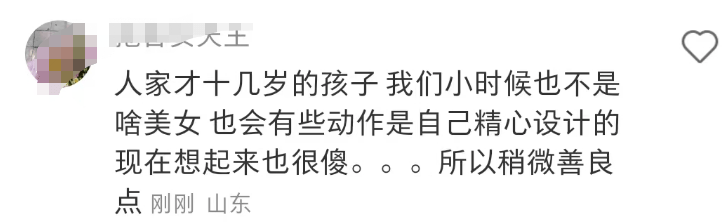 也有网友觉得,她不过也才是一个刚刚15岁的小女孩儿,没必要这么吐槽,谁的小时候都会有那么一些自己觉得非常好看,精心设计出来,结果长大后看到又觉得十分傻气的时候。