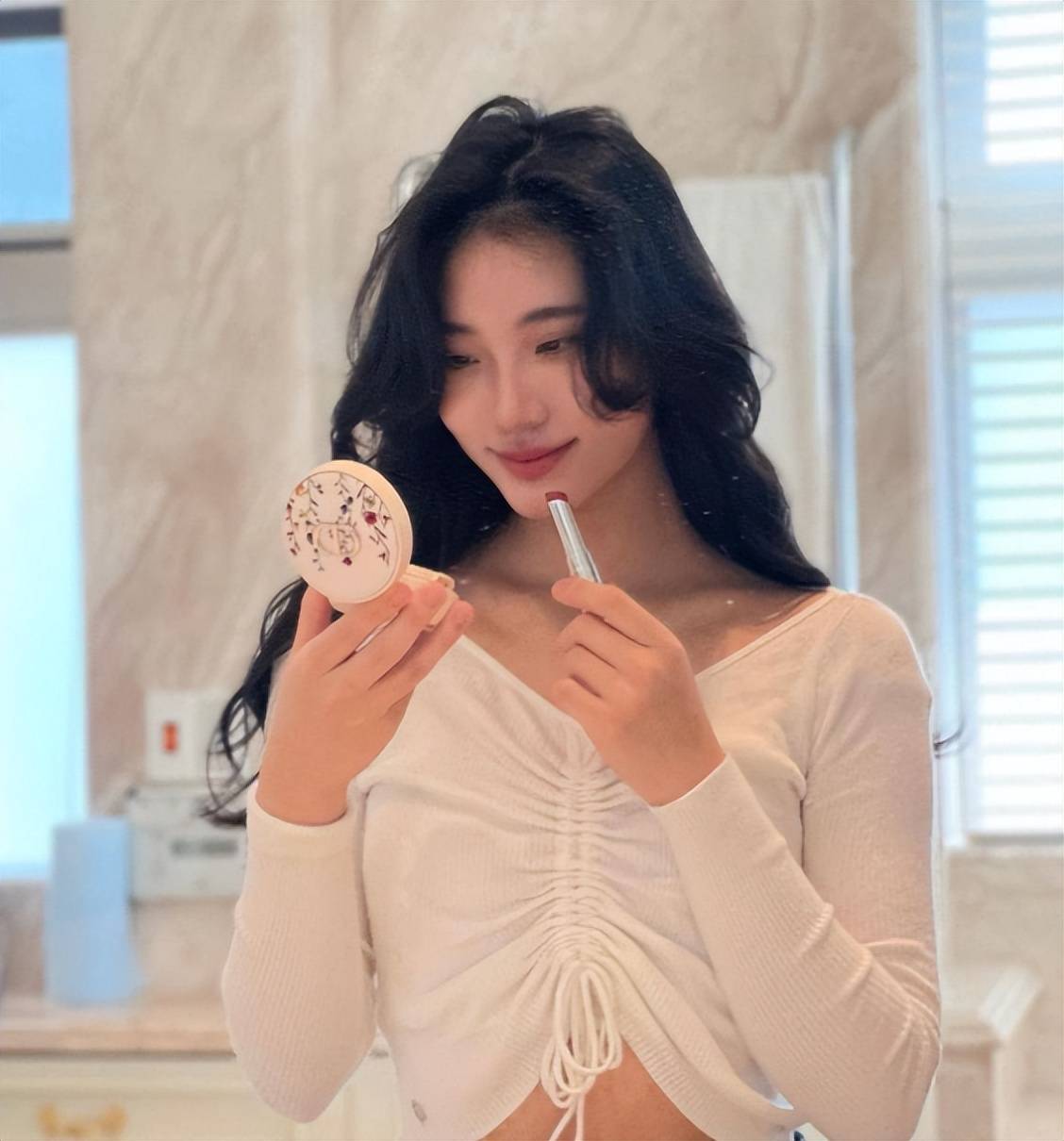 视频中的许韶恩,上身穿着一件白色抹胸搭配粉色的外搭小衫,下身是超短的牛仔短裤,大长腿相当吸睛。