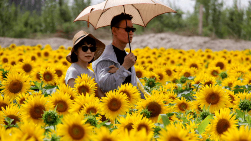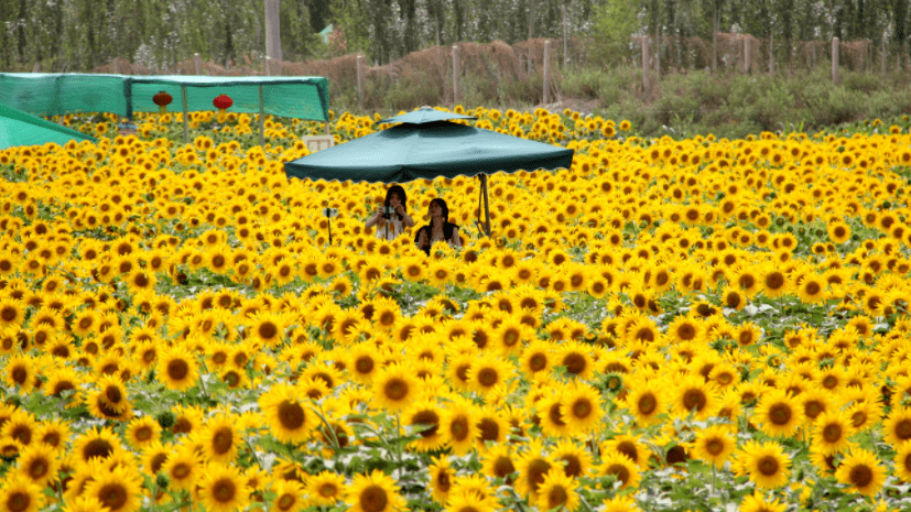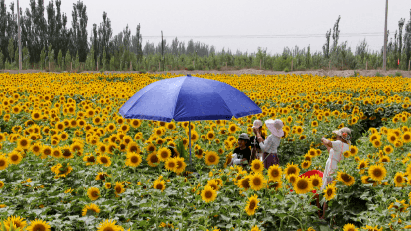 盛夏时节,新疆库尔勒市阿瓦提乡明昆格尔村的数万株向日葵灿烂盛放,如诗如画,吸引不少游客纷至沓来。