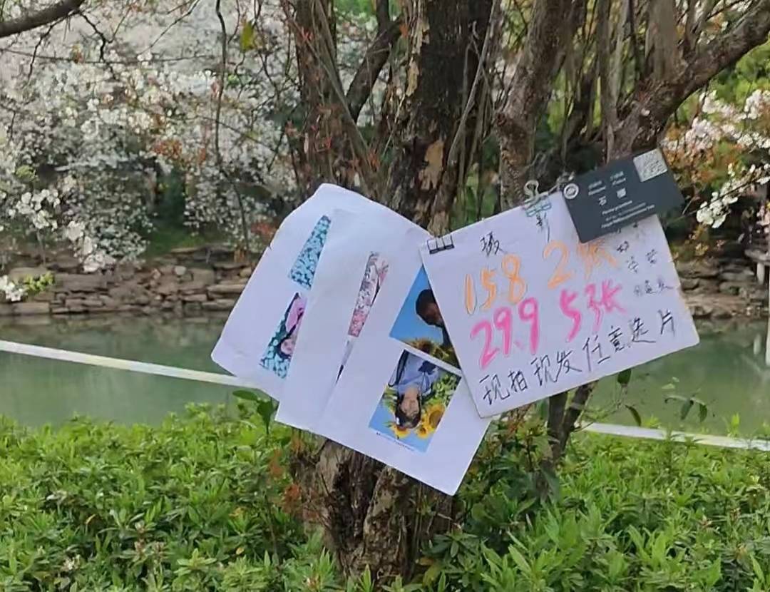 而在世界名花广场、樱花湖周围,分散着五六个摊位,有行李箱里面装满各种拍摄道具的、有自带补光灯的、有手拿展示纸做流动摊位的。这些摊点均未使用高分贝音响设备。