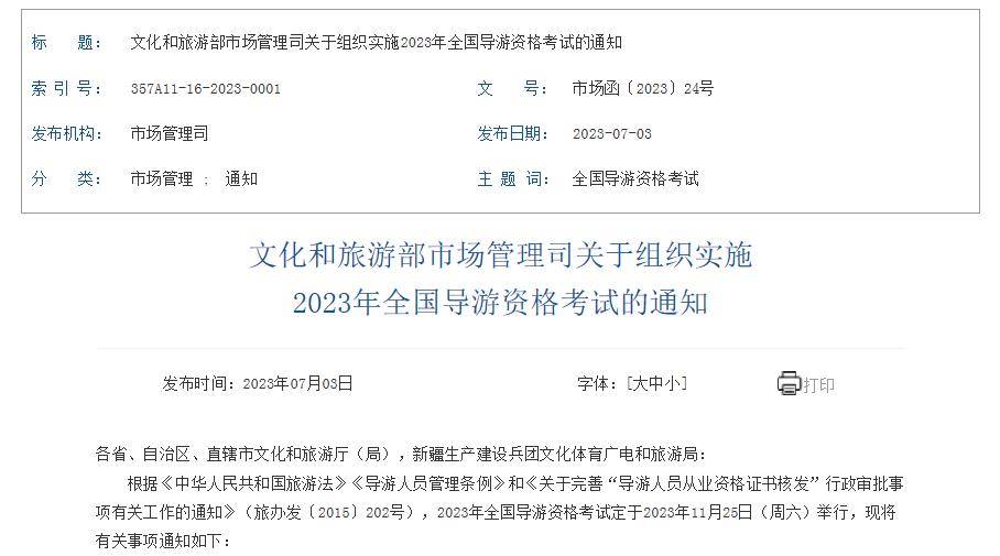 根据《中华人民共和国旅游法》《导游人员管理条例》和《关于完善“导游人员从业资格证书核发”行政审批事项有关工作的通知》(旅办发〔2015〕202号),2023年全国导游资格考试定于2023年11月25日(周六)举行,现将有关事项通知如下: