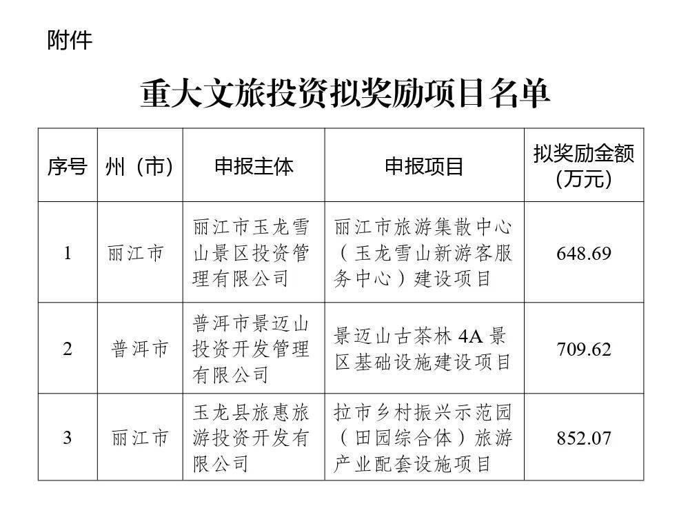 根据《云南省人民政府办公厅印发关于精准做好疫情防控加快旅游业恢复发展若干政策措施的通知》(云政办发〔2022〕10号)精神,经企业申报、县(市、区)初审、州(市)复审、省级评审,现将《2022年重大文旅投资拟奖励项目名单》(详见附件)予以公示。公示时间为2023年7月3日起5个工作日。
