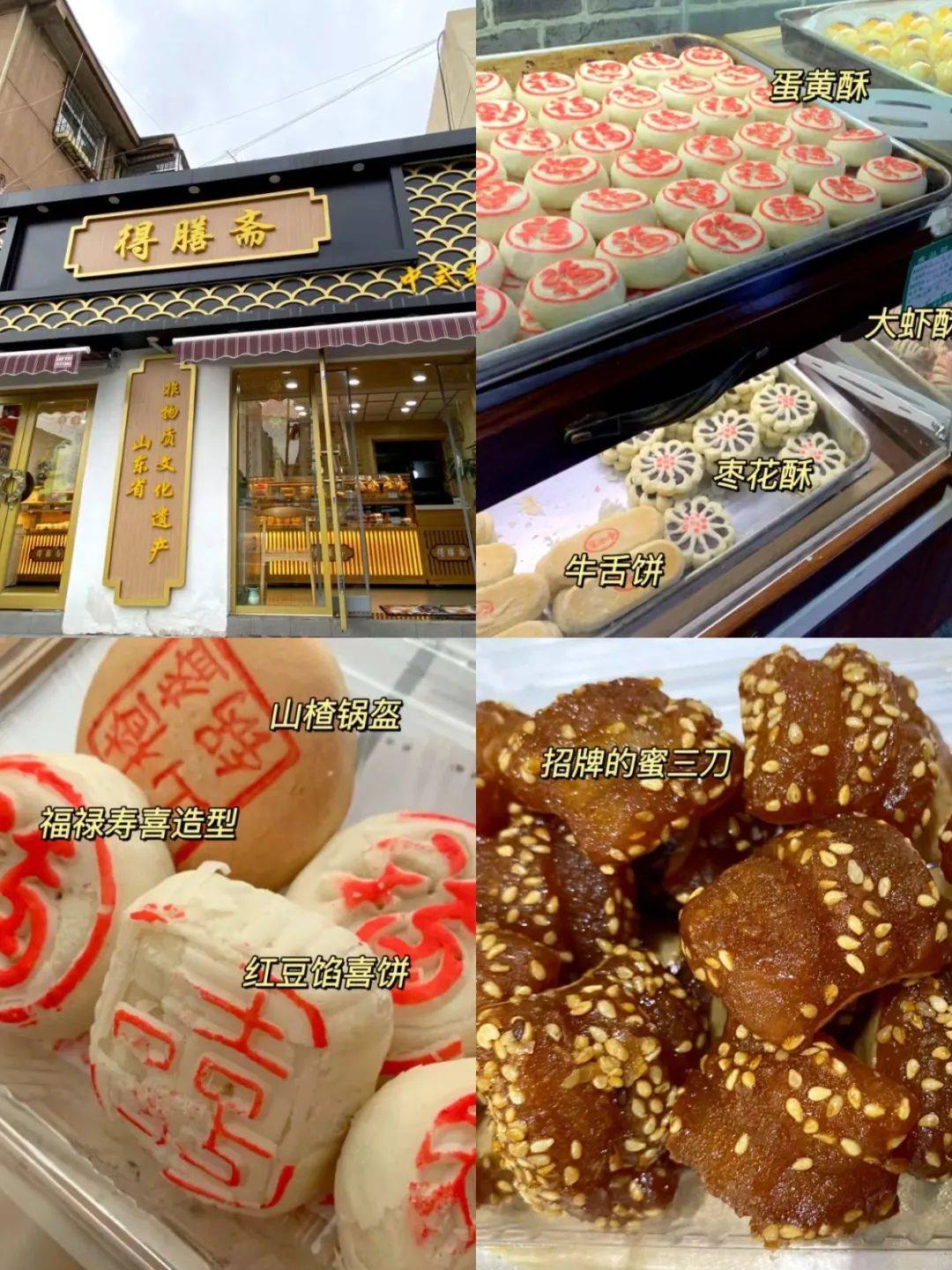 得膳斋,距离红门很近。店已经是非物质文化遗产了。不大但点心种类比较多,强推蜜三刀必买,外酥里软,芝麻香气浓郁,甜而不腻。再就是各种类型的素饼,种类比较多,比如玫瑰酥、芝麻酥、山植、枣泥酥等、还有老桃酥(注意可选无糖口味)、蛋黄酥、老式面包等,还有无糖口味哦。