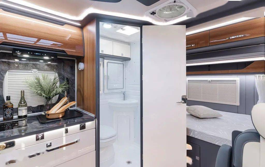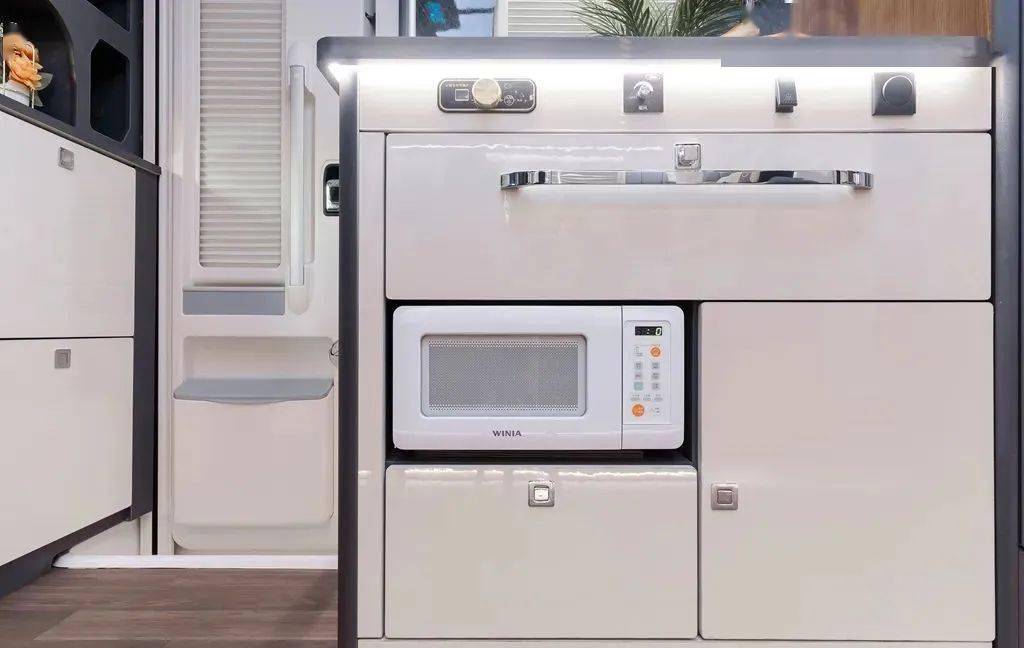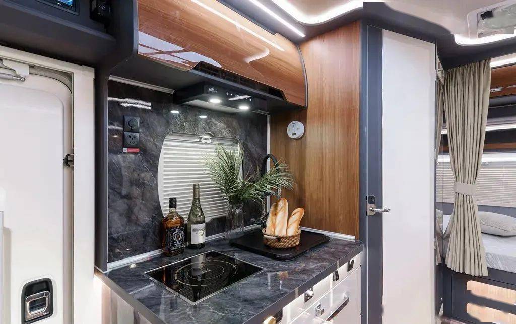 在厨房区域,车载专用冰箱保障家人每天可以吃到新鲜食材。带盖水槽、电磁炉、多功能微波炉、抽油烟机等是大展厨艺的好工具。厨房设有通风窗户,既通风透气,又可以看窗外风景,高弯可调节水龙头和独立净水系统,解决做饭中的水源问题。