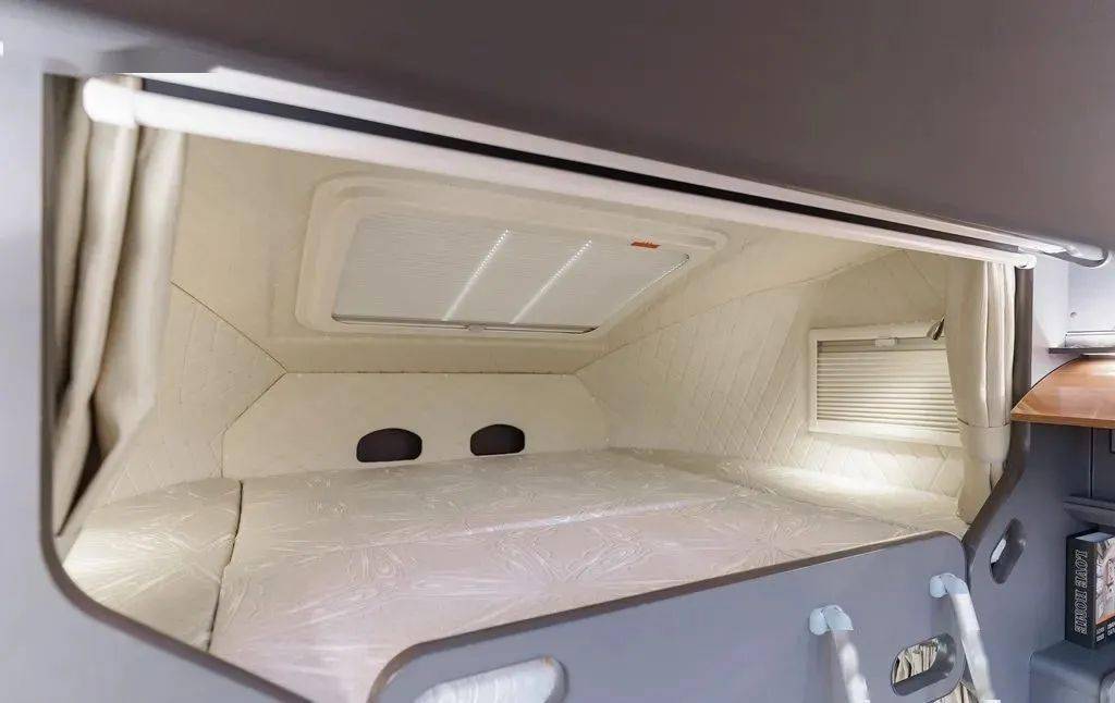 这款房车配有两张双人床,一张额头床,一张后横床, 都配有高密高弹海绵床垫,后床还带有拓展折叠书桌。 整体浅灰色的色调让夜晚更加宁静,睡得更加舒心。