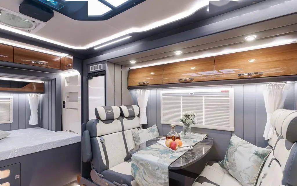 会客区采用的是经典的四人对向卡座设计,整体的灰白配色,额头处的三个实木收纳柜又增添了稳重感,坐在豪华乘用车可调节座椅上,是多么舒适啊,这个座椅还可以拼成床,桌子也是房车专用的搭杆式折叠桌,不得不说这款车在设计上有很多巧思。