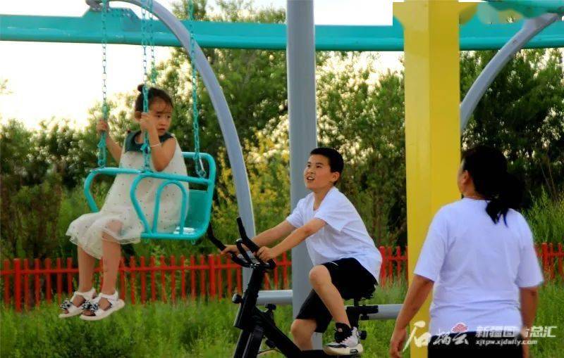 7月1日,游人在裕民县江格斯乡江格斯村农业采摘园的农科智乐园里休闲游玩。近日,该村农业采摘园免费开园迎客,众多游客来此领略乡村风光、体验农耕文化乐趣,乐享假日美好时光。杨化光摄