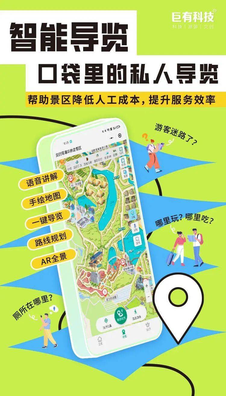 游客扫码自助获取景区电子地地图,提供地图定位、线路推荐、景区导航、语音讲解等,一部手机自助游,节省了游客寻找景点、餐厅、洗手间等设施的时间。