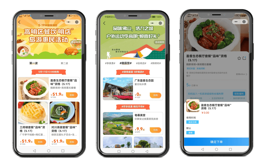 佛山高明以“一机旅游”为活动平台,连续策划了 高明餐饮“明店”旅游惠民活动 ,以“0元抢购”营销拓客引流,以及 户外运动季高明“惊喜好礼”活动 ,联动当地美景、露营、美食明店、特产明材,以5折畅游优惠福利, 激发文旅市场消费活力。