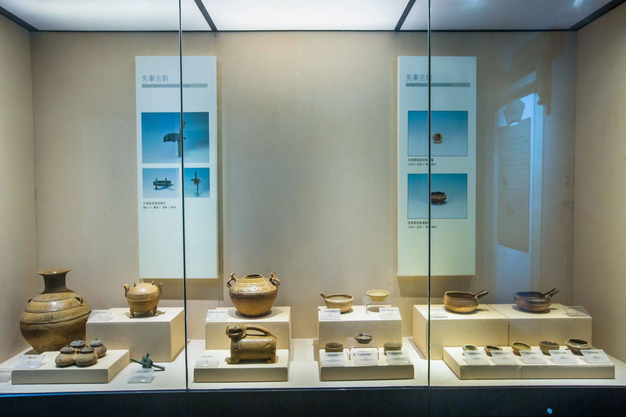 先秦时期的陶器已尽显精美,无论陶罐还是食皿都造型圆润,在灯光的照射下泛着柔和的光泽,这种从“无釉”到“有釉”的陶器烧制方式为之后更加成熟的烧制工艺打下了基础。