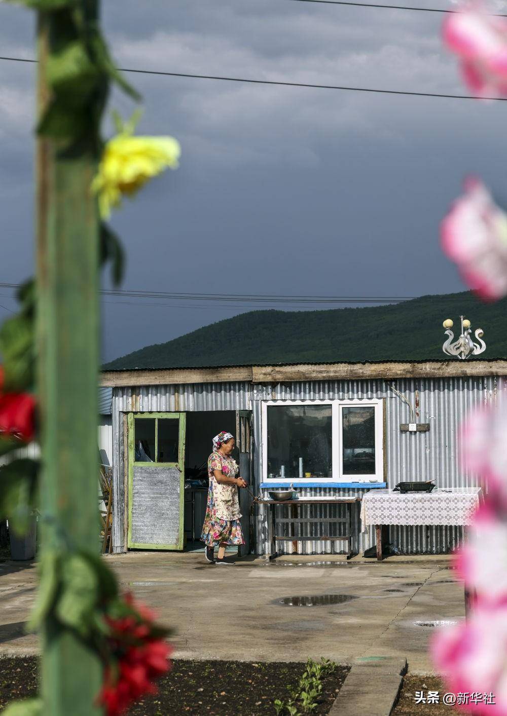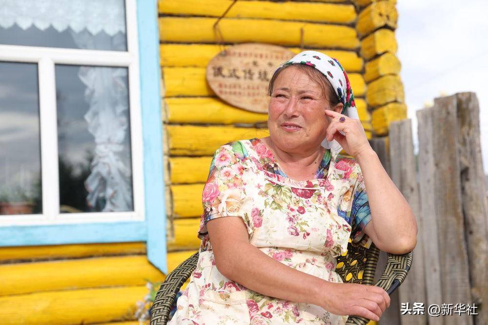 6月28日,考占花(右)坐在院子里唱起俄罗斯族歌曲。