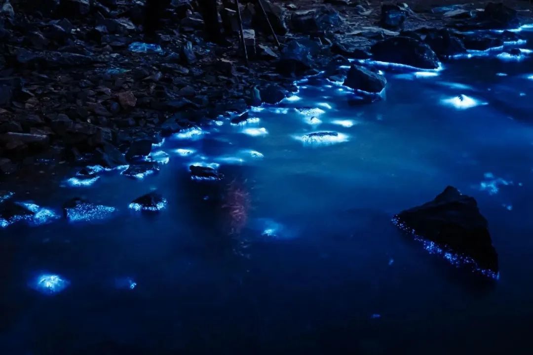 这里几乎没有什么灯光,走在海滩上,脚下就是一片片明灭的荧光,海浪层层涌起,泛起圈圈点点的蓝色涟漪,像是万千繁星坠入海水间,蜿蜒成了璀璨的水中银河。