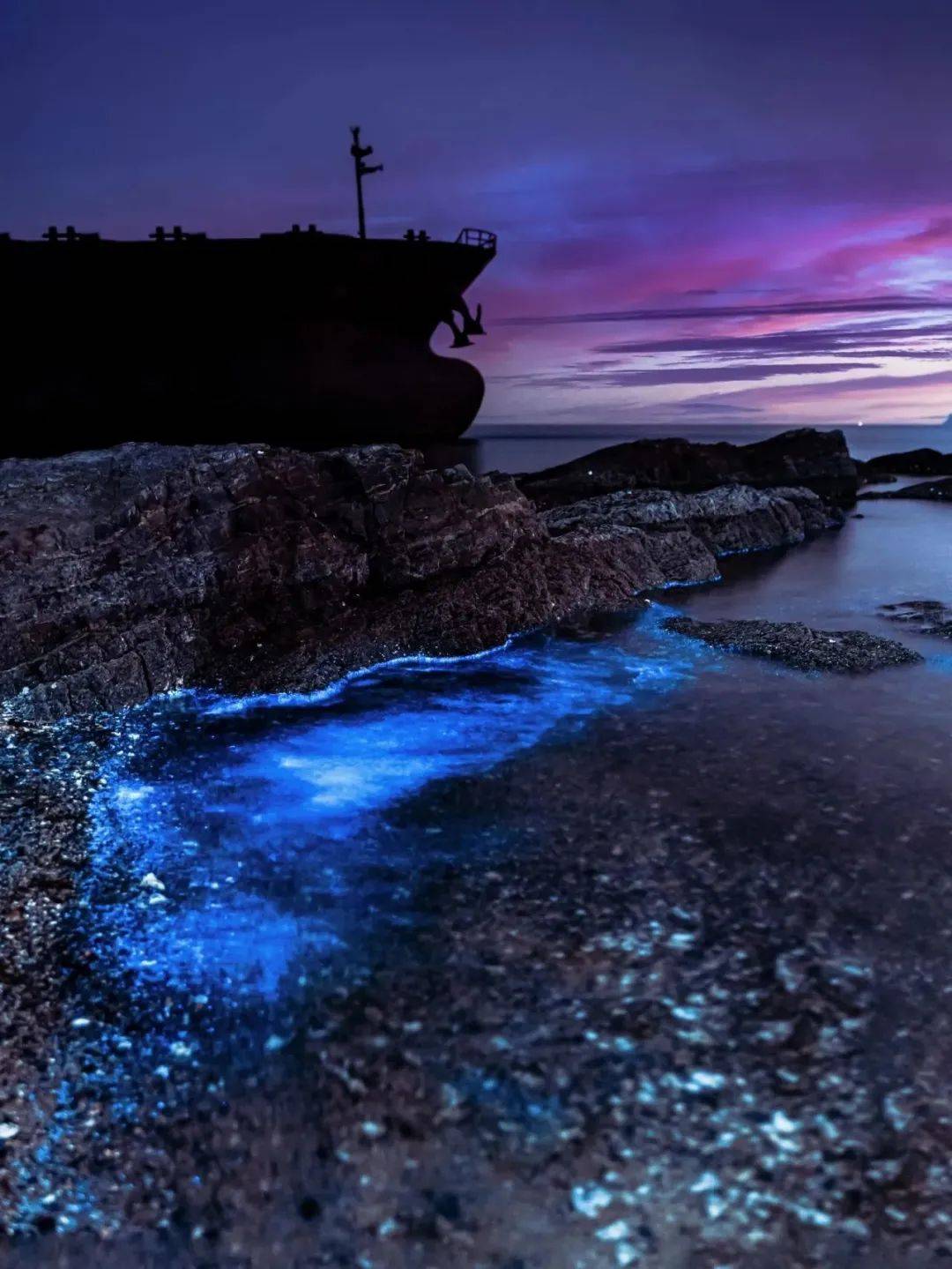 春夏时节的大连,能够偶遇荧光海的地方可不少,但最惊艳的还是要数大黑石海滩和小黑石海滩,几乎这时节的每一天都可以见到。