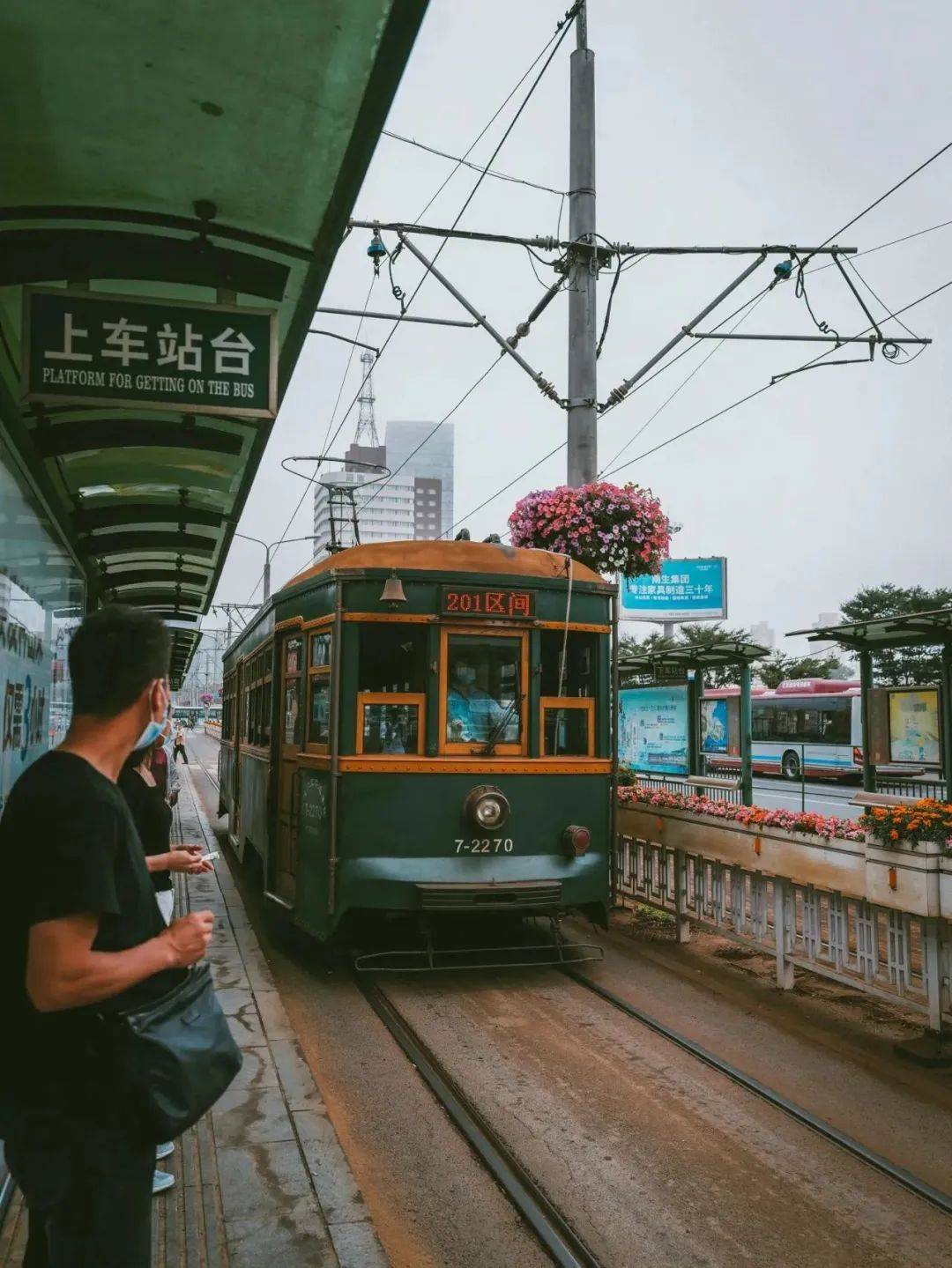 若说挑选一个春日最佳的上车点,海之韵公园的公交站一定是打卡必去之地!听着电车与轨道发出的叮当声,看着复古的201路“绿皮车”从远处灿烂的槐花中驶来,就像是从春天而来的童话列车。