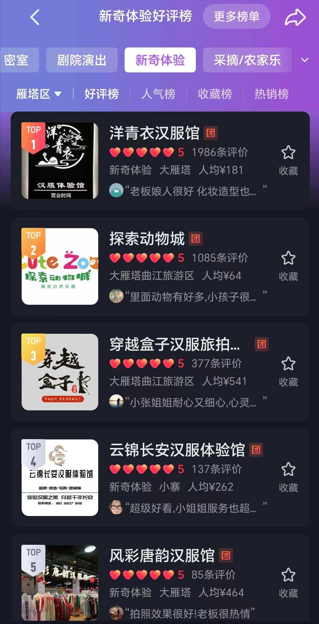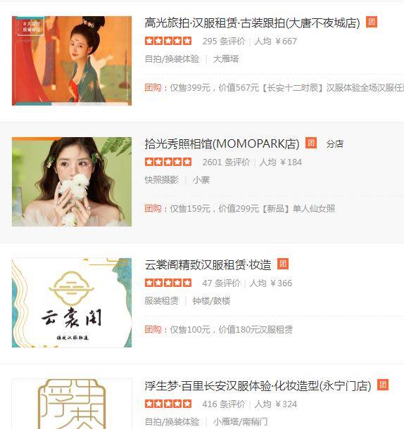 而如果你在寻找某种声音,你也可以清楚地看到,在西安的“新奇体验好评榜”中,前5名中有4个与汉服有关,而汉服馆的销售情况,第一名是,已经突破一万。按花费99元计算,这个单品的总销售额已经是100万元。