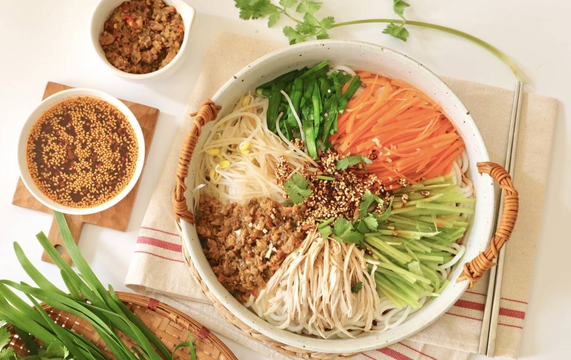 记得儿时去参加婚宴,最喜欢的菜就是酸酸甜甜的凉米线了,作为婚宴的头菜,它不仅开胃可口、清爽解腻,更是五色焕然,看起来赏心悦目。雪白的米线作底,上面整齐的码上墨绿的韭菜香菜、橙黄的胡萝卜丝、翠绿的青笋丝、米黄的炒香花生碎、棕色的肉酱,再浇上乌黑的甜酱油、鲜红的油辣椒等调料,一碗清爽开胃的凉米线就做好了。对于酷爱米线的云南人来说,汤米线在炎炎夏日略显油腻厚重了,而清新凉爽的凉米线最是夏天的绝配。来云南旅游的话,也来尝尝这份小吃吧!