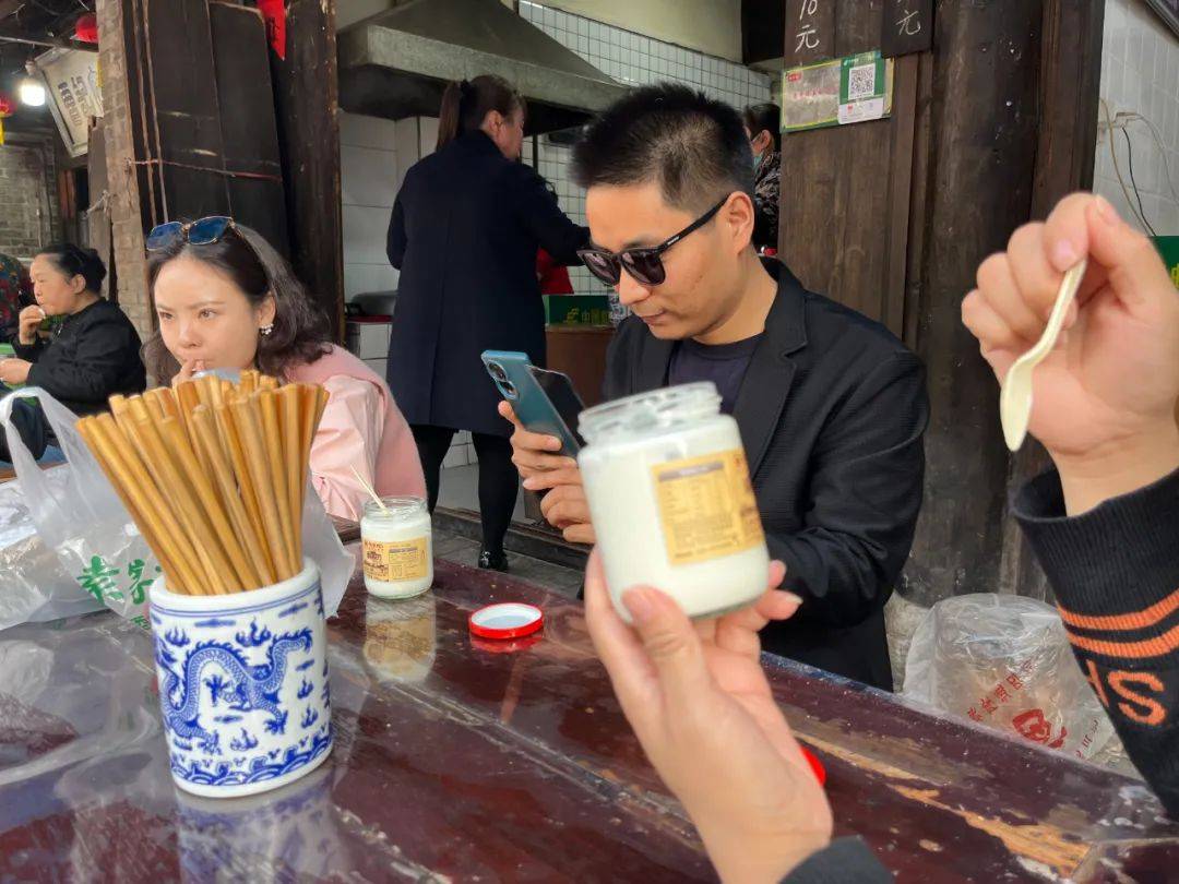 进入袁家村,天气晴好,游人很多。有些像苏州的老街,又感觉像武汉的昙华林,或者说像户部巷,因为除了吃还是吃,各种各样的面食面点,混合着油辣子的香味,夹杂着南来的北往的口音,我们一行很快被裹进这喧闹的烟火气中。看着各种小摊上全神“嗦”面的游客们,口水吞了一肚子,奈何午餐吃太饱!即使如此,还是在亓老师及同行的董县长、李书记的推荐下就着董县长张口即来的妙趣段子每人暴敛了一瓶袁家村酸奶、一碗号称最正宗的一口香!然后来一壶茯茶消化食,围桌而座,听董县长和李书记把西安本土文化娓娓道来,惬意,知足!
