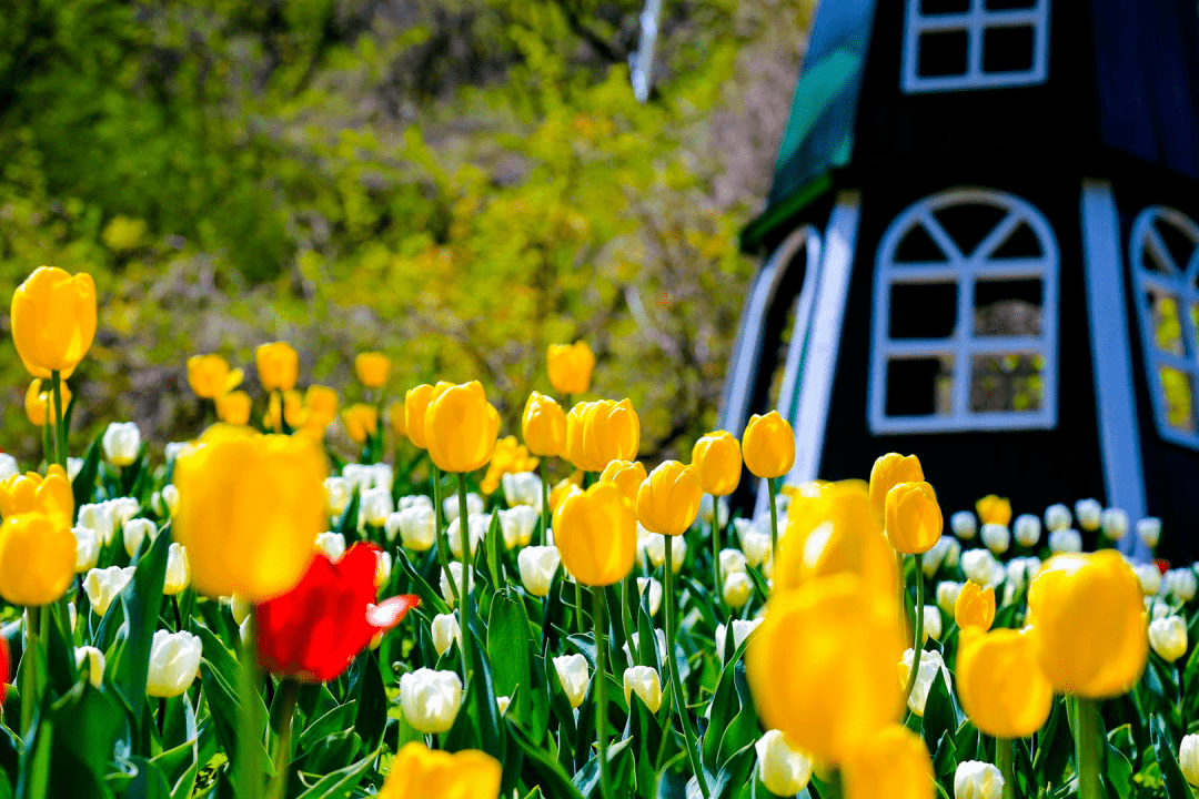 黄色、粉色、红色的万株郁金香竞相开放,抬眼望去,一片彩色花海,随着微微春风翩然起舞,生趣盎然。两处花海任你选择,徜徉其中,怡然自得。