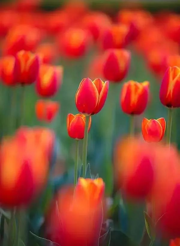 滨州的郁金香更像火,红黄渐变的花瓣洋溢着更多春的气息,鲜艳明亮的搭配好像油画照进现实,色板打翻在这片绿色的土地上,更带来无限生机。