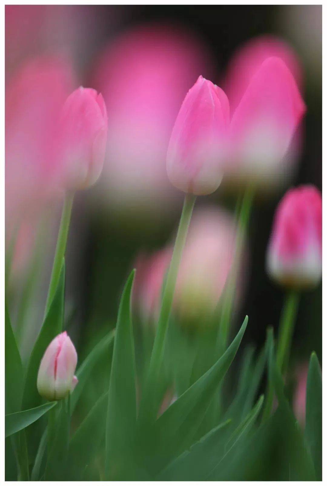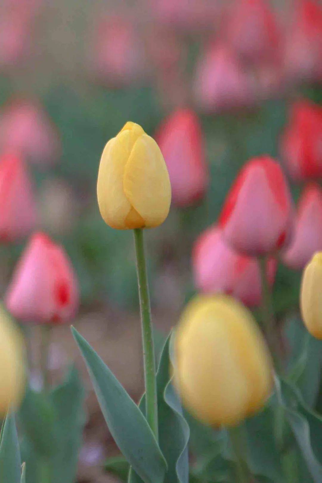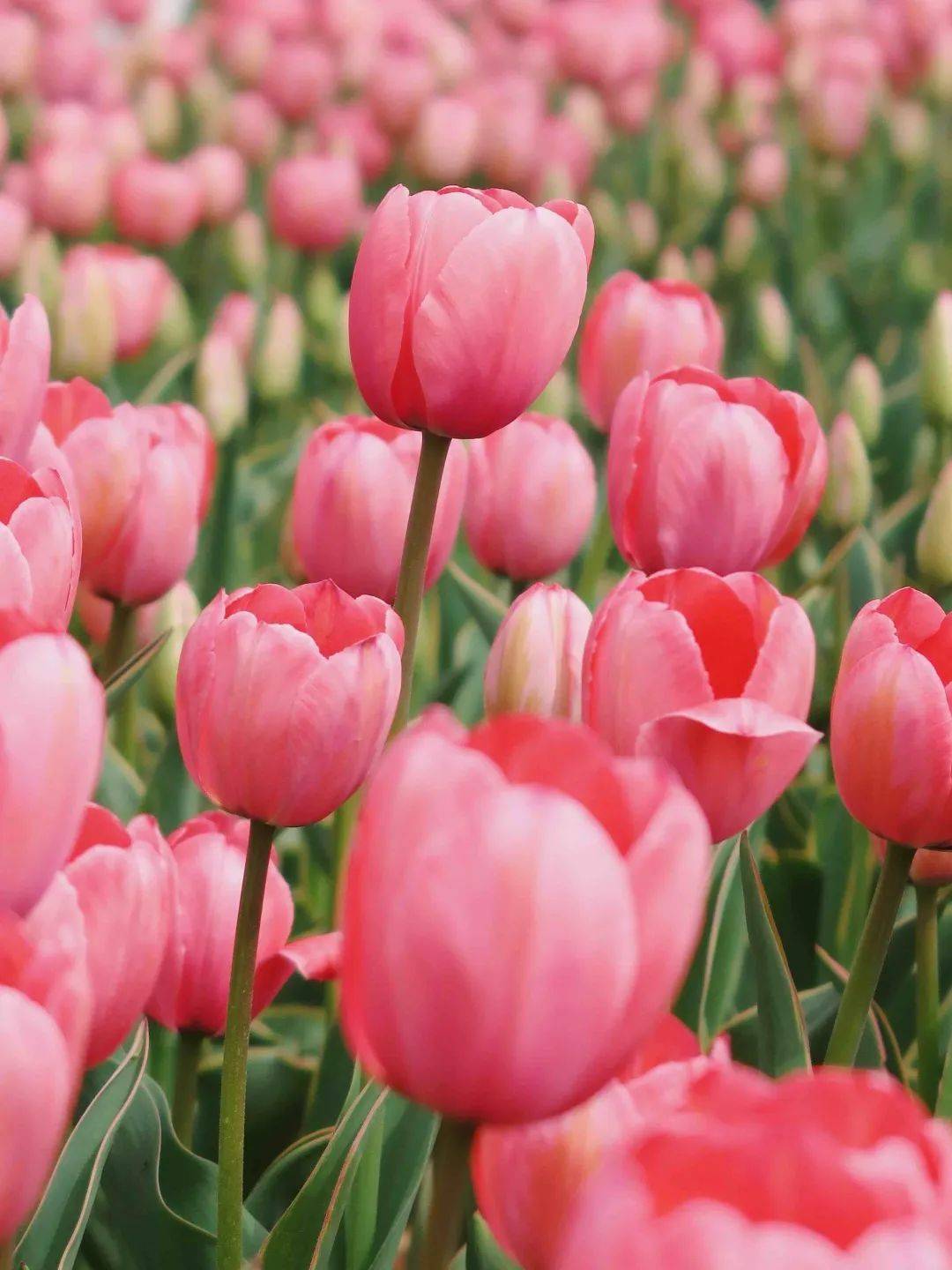 远看是一片绚烂花海,随风而动,耀眼的色彩书写着春的生机,仿佛落入画中世界;近观,则是娇嫩饱满、棵棵分明、具体的花朵,根茎细腻有韧性,叶尖微微舒展,向阳而生,优雅脱俗。