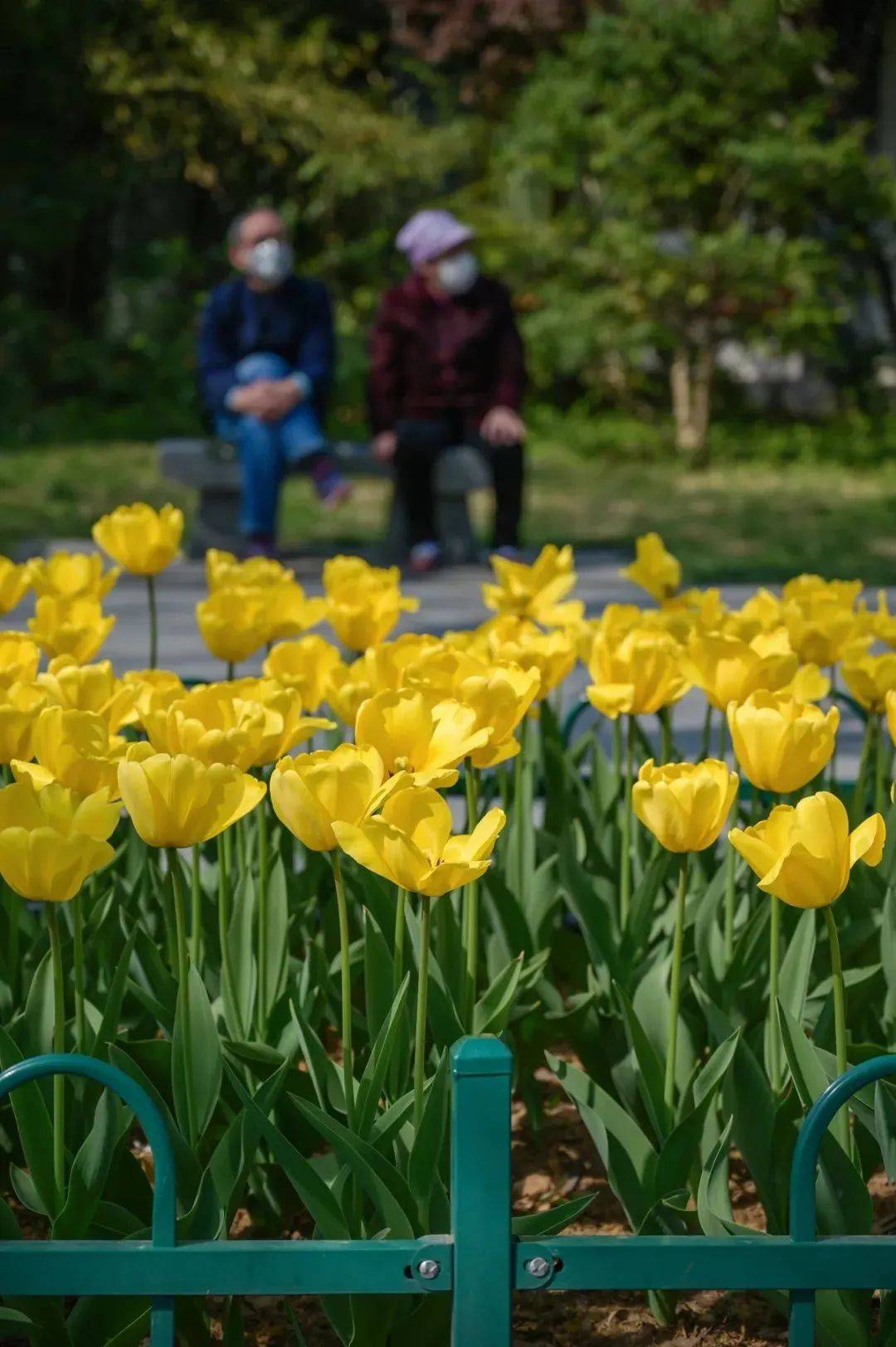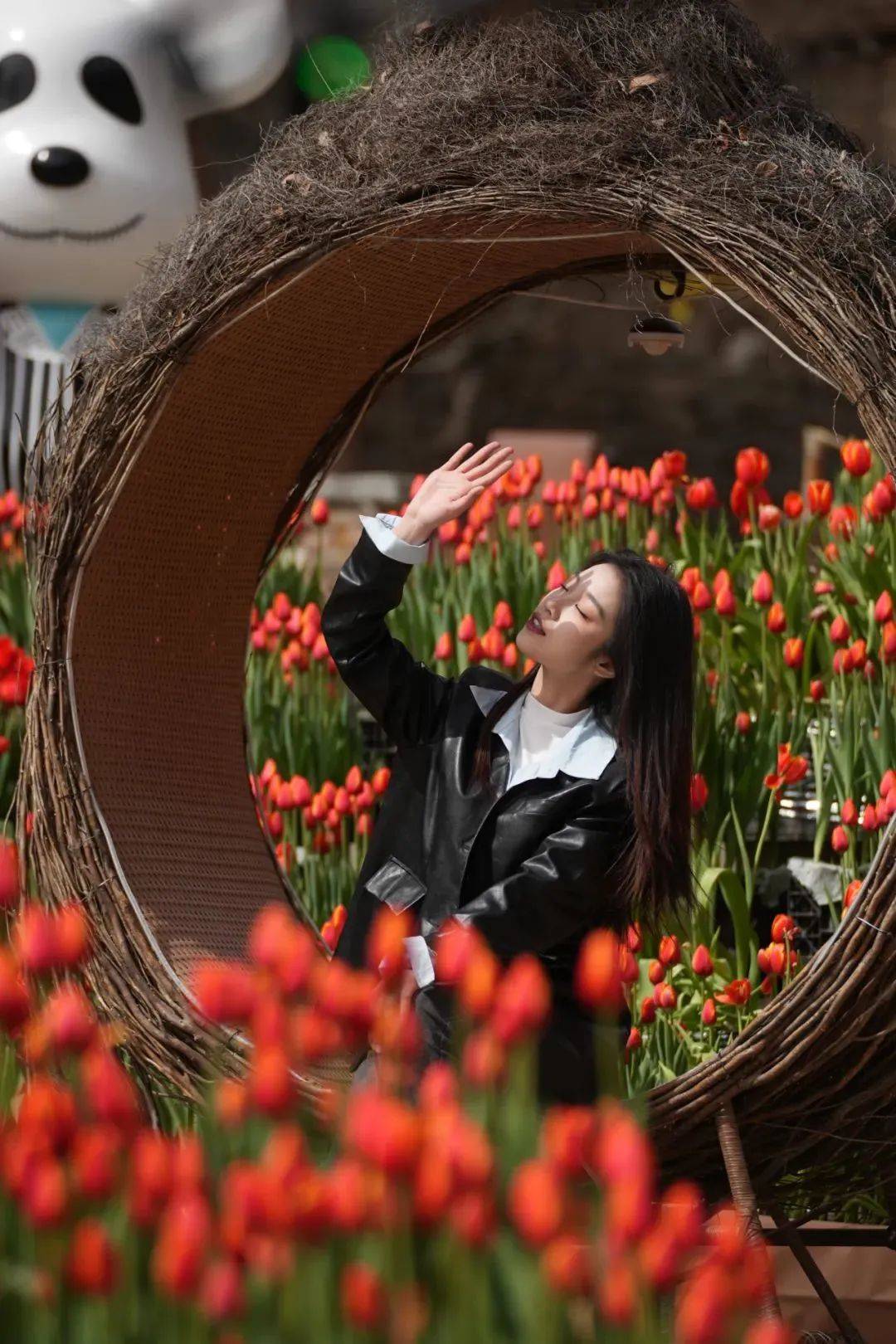 你可以在环状鸟窝凳上与身后的郁金香“背景板”来个相框合拍,也可以坐在长椅上仰头与郁金香花丛来个亲密接触,所到之处,都是绝佳的春日打卡地。