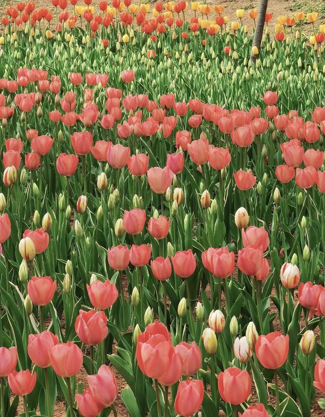 由于南部山区的温度差,红叶谷的郁金香要更晚开放,相比市内的粉色郁金香颜色、种类更多,也更加密集。