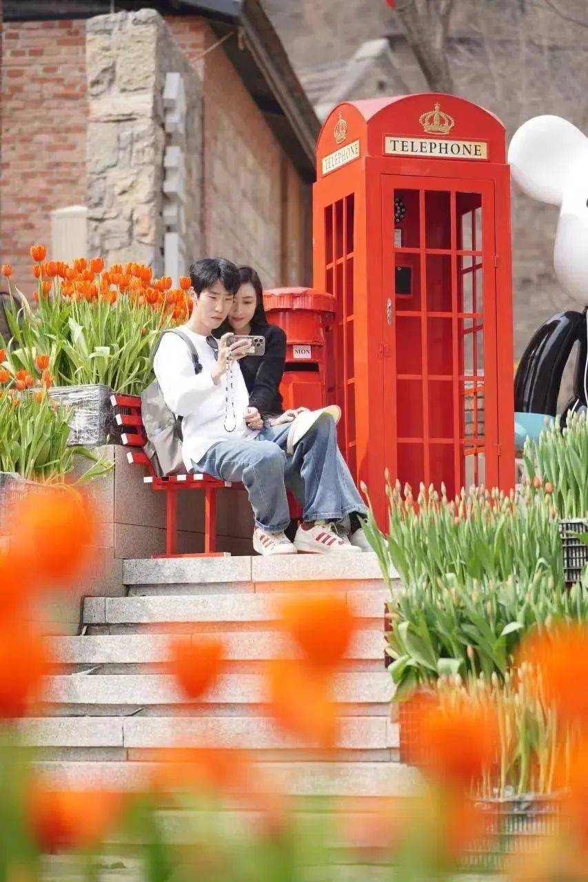 橙红色郁金香含苞待放,一簇接一簇,排列整齐,景区内布局着可爱的卡通雕像、红色电话亭以及ins风满满的路标。