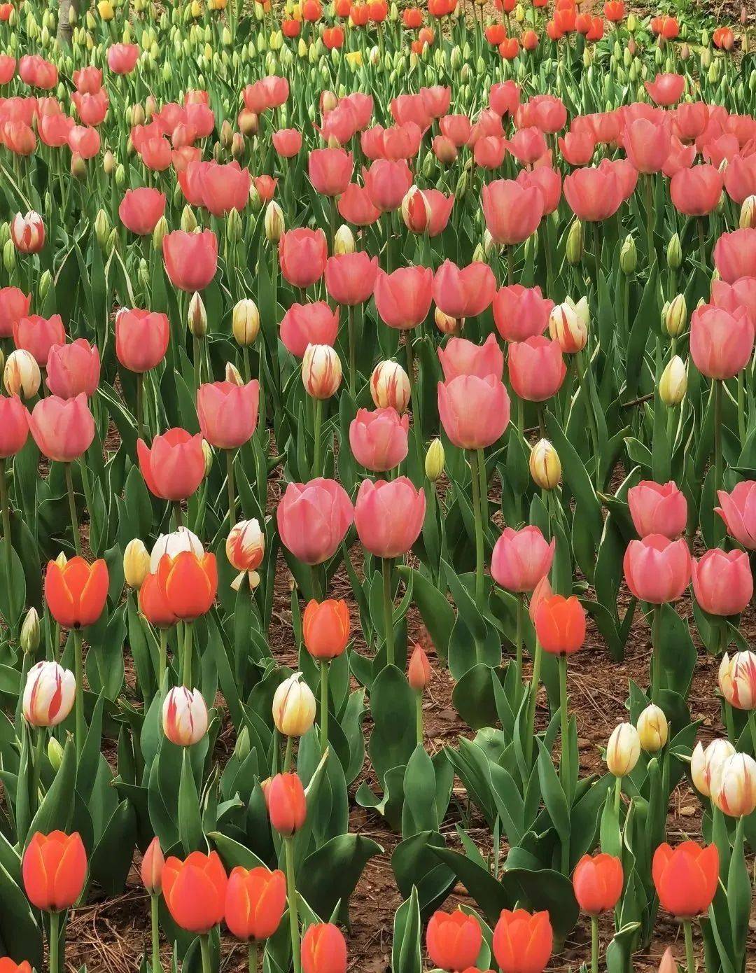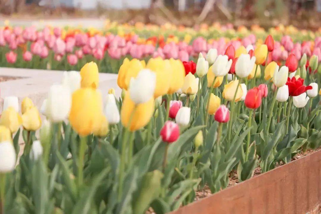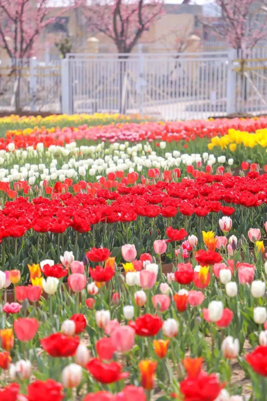 这里郁金香品种多样,整齐排列,密密匝匝。红、黄、粉、紫、白各色交织,绘就一幅明媚动人的人间春色图。