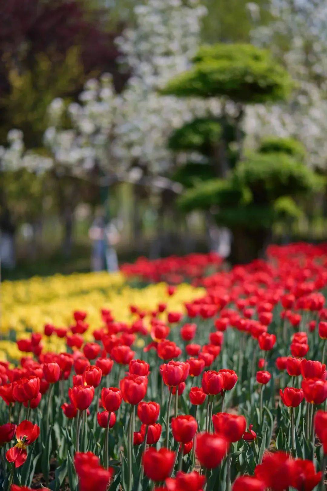 四月的潍坊不仅属于风筝,同样也是郁金香花开的时节。从新华路与宝通东街东北角进入植物园,迎面就是大片的郁金香花海。
