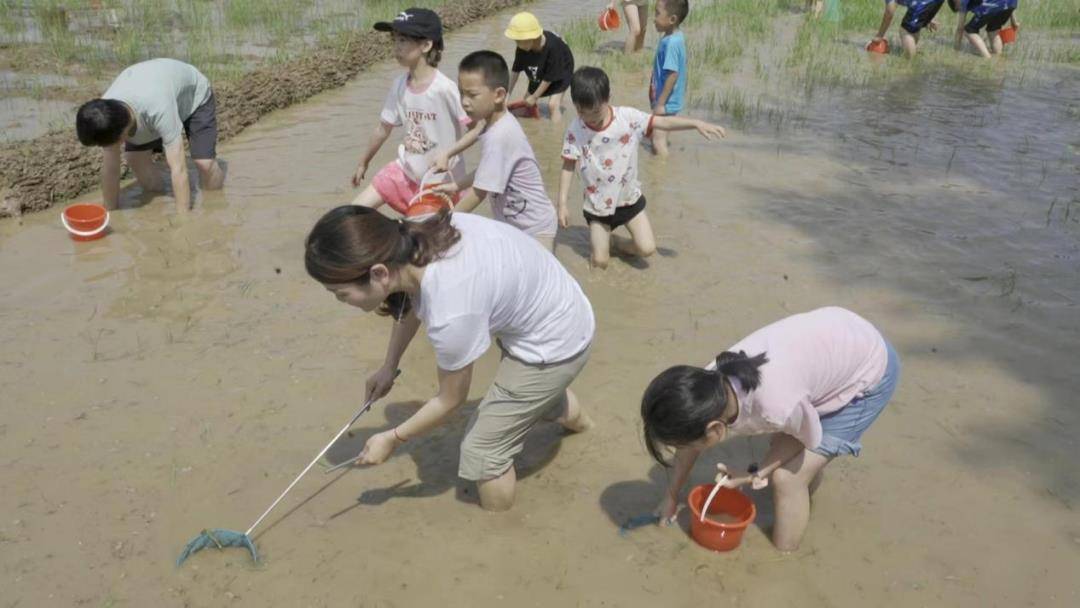 【游客宁婷:今天天气好一些。我带了大人和小孩。听说今天是蔬菜丰收节。来这里体验一下这种蔬菜采摘吧。让孩子们来这里玩。很好,现在家里大人都在那里摘菜,孩子们在这里玩这个游戏,这种感觉真好。】