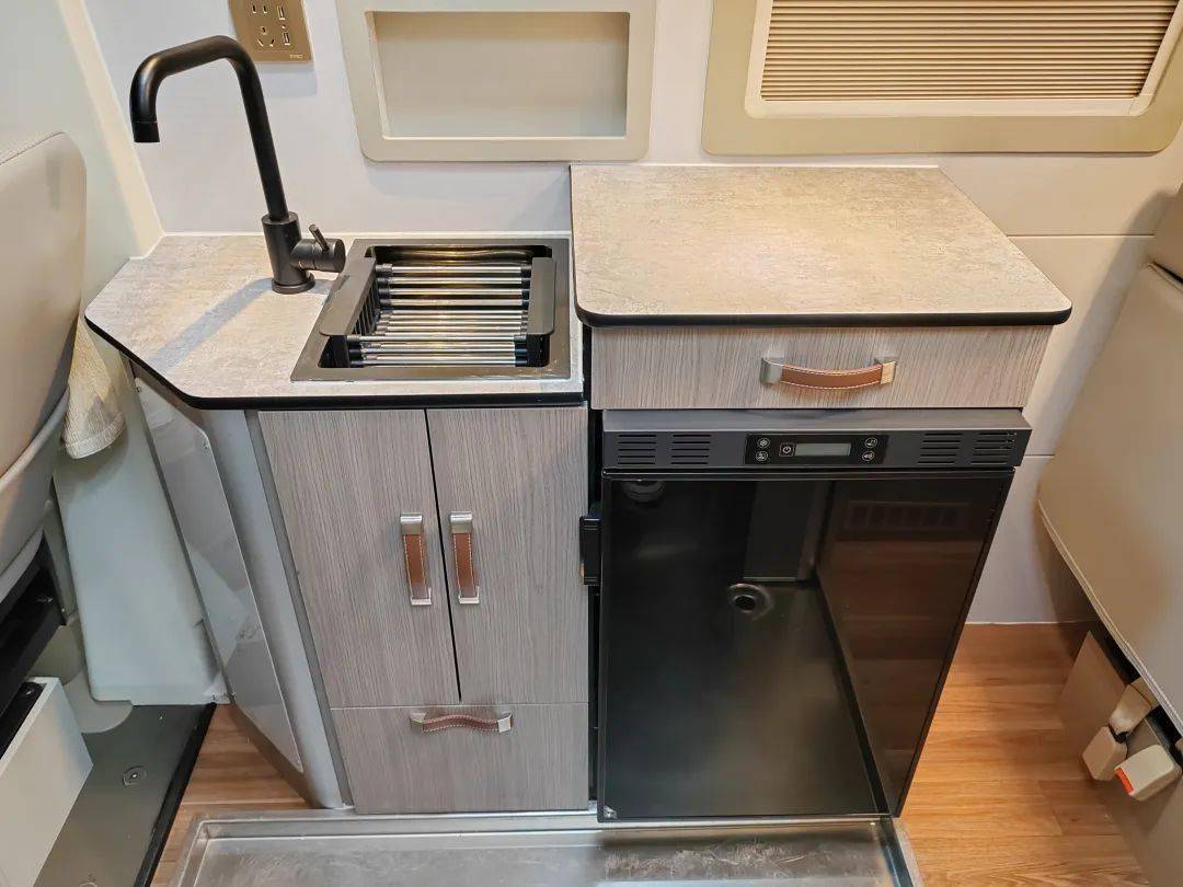 厨房区位于副驾驶后方,配备有开放式洗菜池、独立水龙头、70L冰箱和储物柜等。