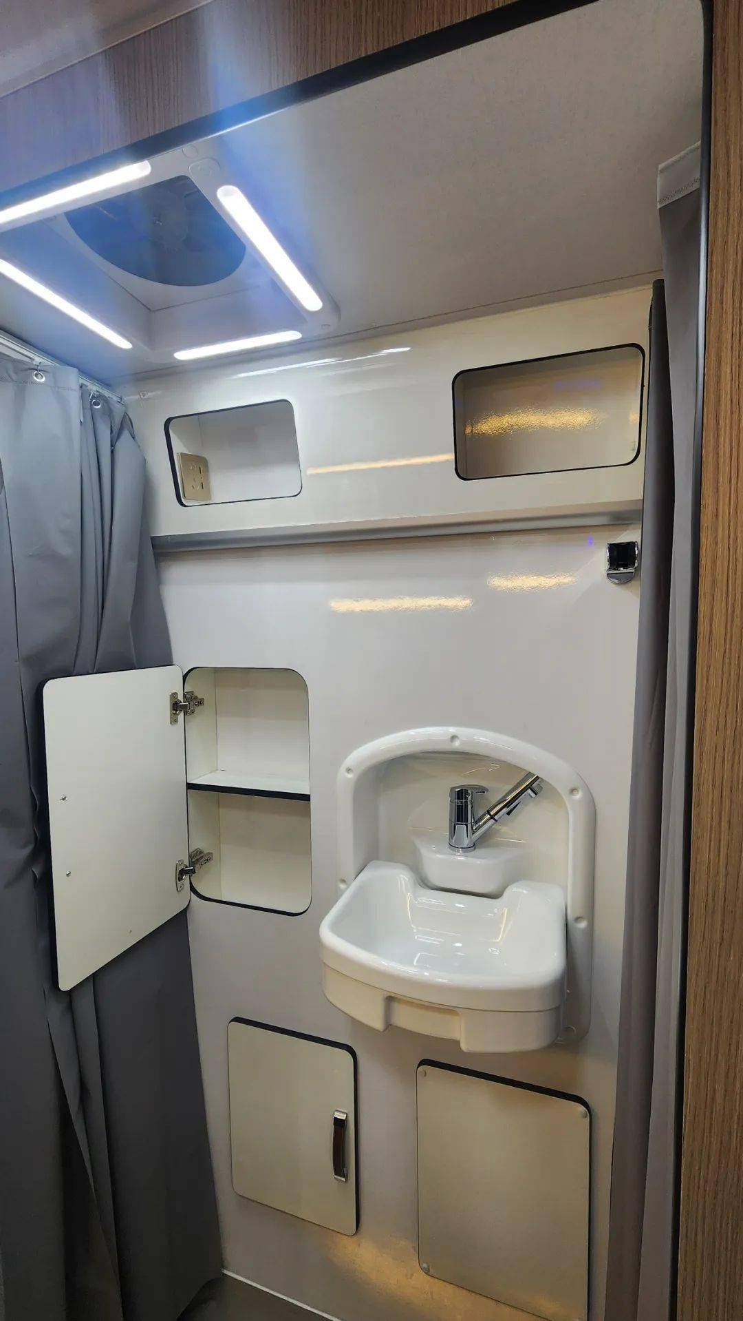 抽拉式卫浴间位于厨房区对面,需要时可以展开使用。内部配备有折叠式洗手池、换气扇、浴帘、储物柜、移动马桶等。