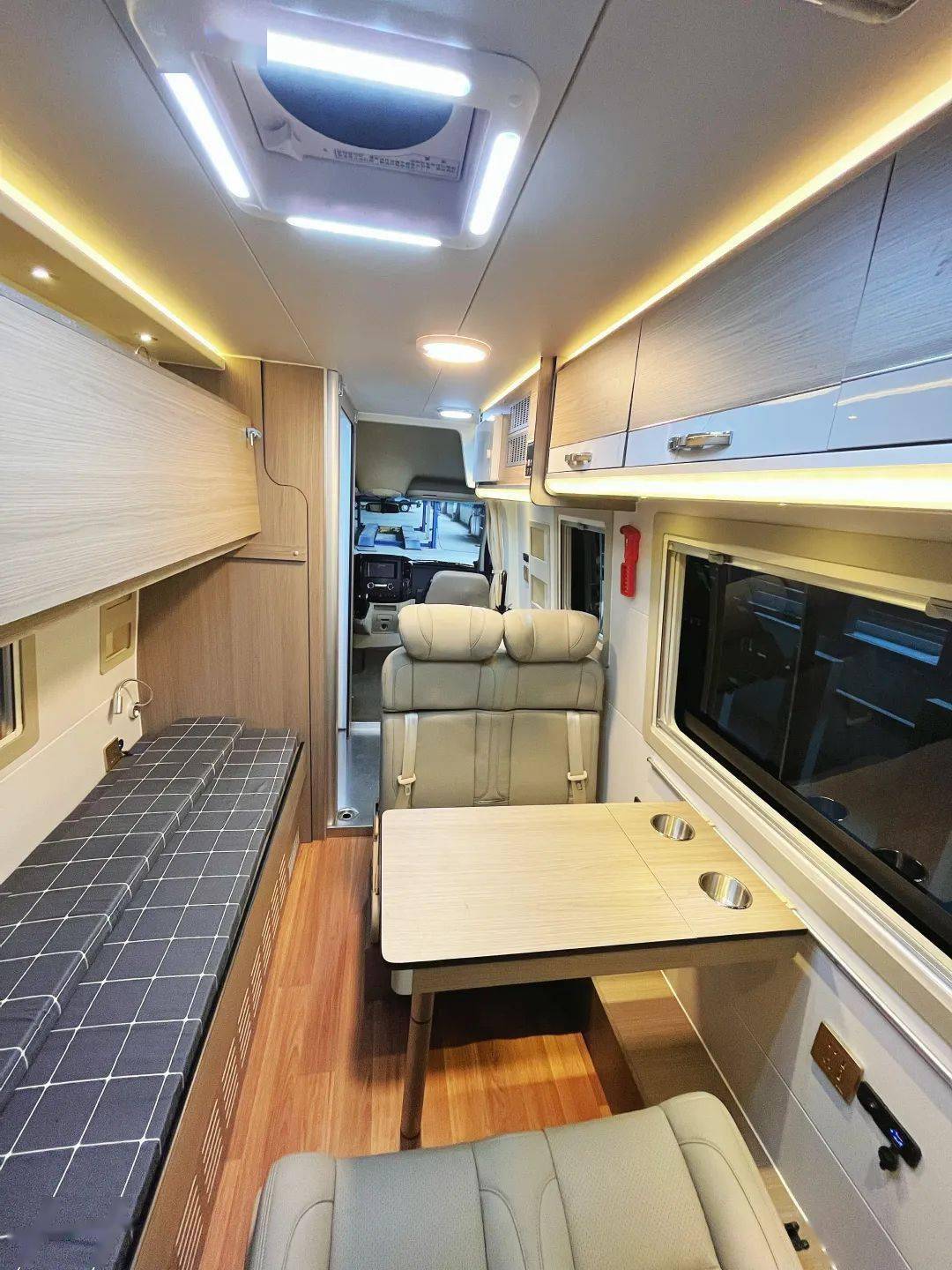 实拍车型布局与大多数房车不同,驾驶室后方为厨房区和卫浴间,卡座和休息区则位于车尾。