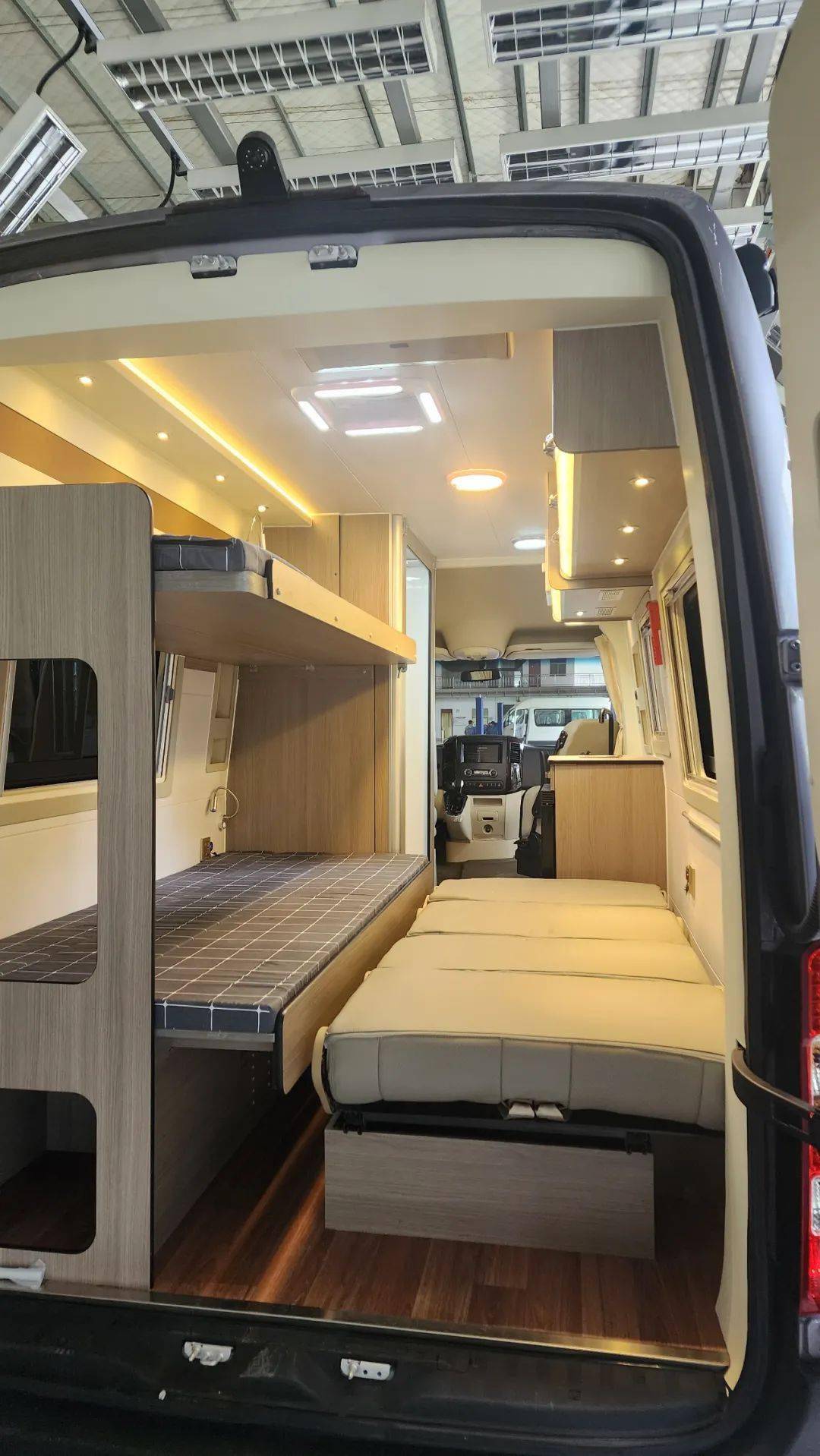 这款房车的底盘源自先前与奔驰合资期间的凌特客运底盘,品质有保证。车身尺寸为5915/5995×2040×2632/2850mm,有 原厂电动门和无中门版可选,蓝牌C本即可上路。